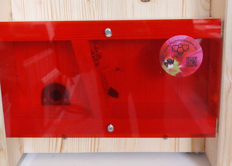 Besonders schön ist die Möglichkeit, die Hummeln im Vorbau durch eine getönte Platte zu beobachten, während sie die Hummelklappe betätigen. So können Sie hautnah miterleben, wie aktiv und geschäftig diese faszinierenden Tiere sind.